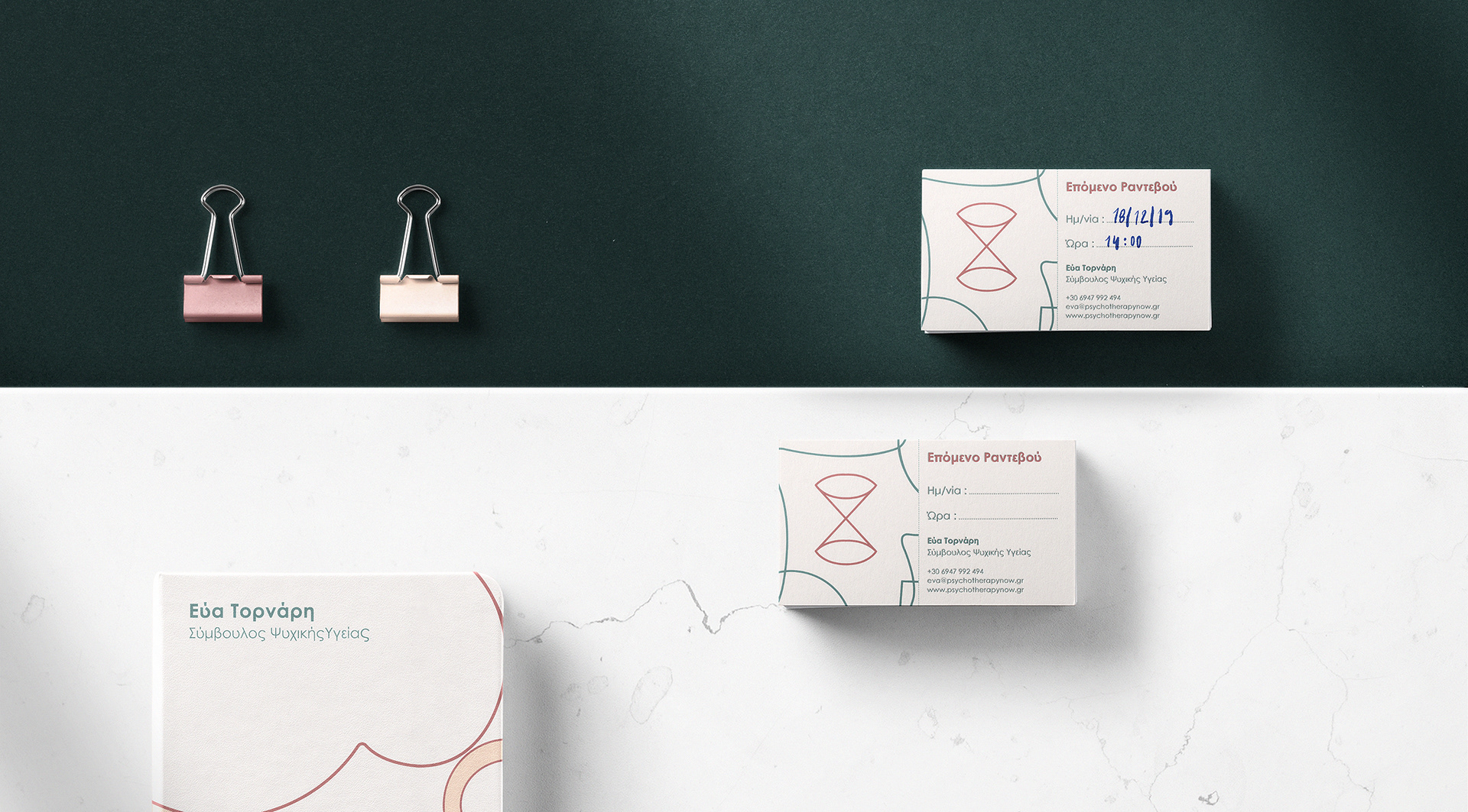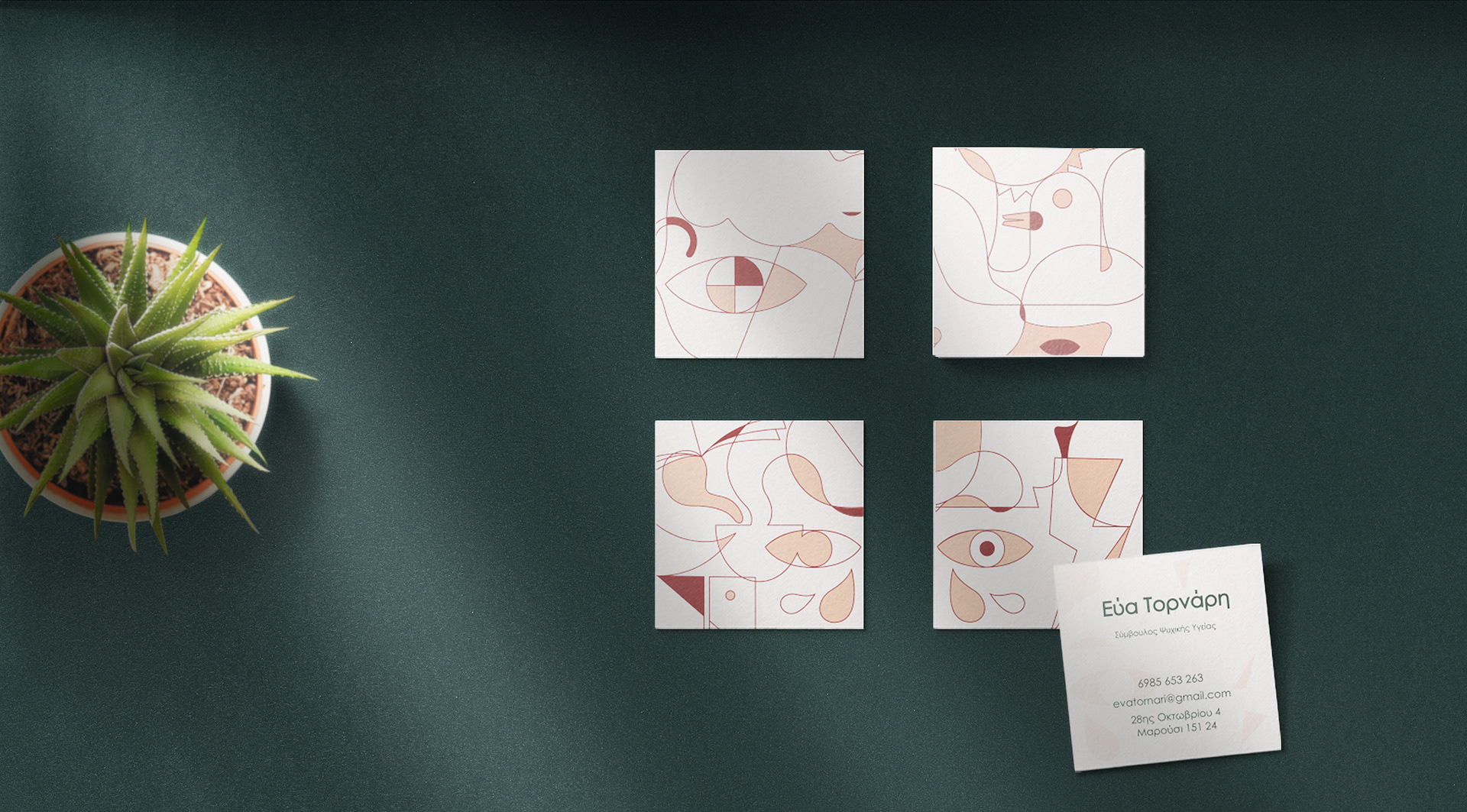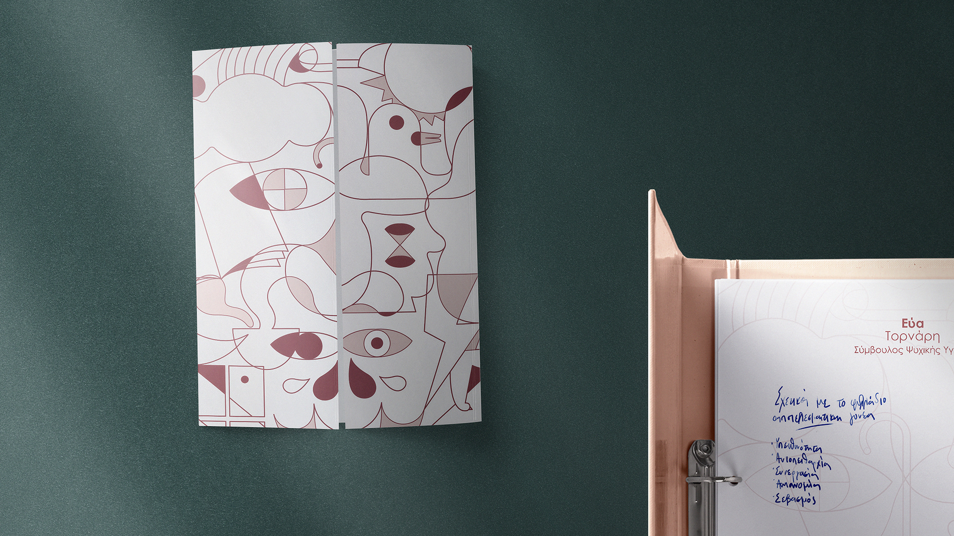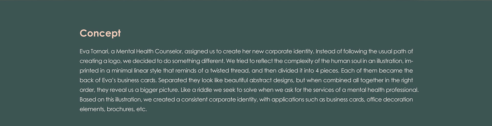 Eva Tornari, a Mental Health Counselor, assigned us to create her new corporate ID. Instead of following the path of creating a logo, we decided to do something different. We tried to reflect the complexity of the human soul through an illustration, imprinted in a minimal linear style that reminds of a twisted thread and separated it into 4 pieces. Each of them became the back of Eva’s business cards. Divided, they look like a beautiful abstract design. But when combined all together in the right order, they reveal us a bigger picture. Just like the riddle, we desire to solve when asking for the services of a mental health professional. Based on this illustration, we created a corporate identity with consistency, utilizing it beyond business cards, as an office decoration element, in brochures and other applications.