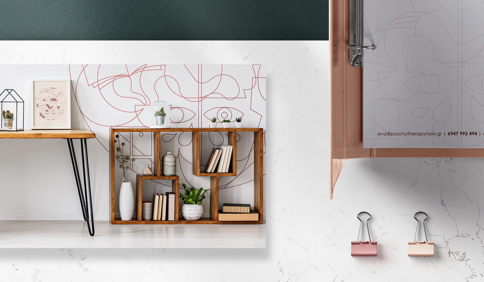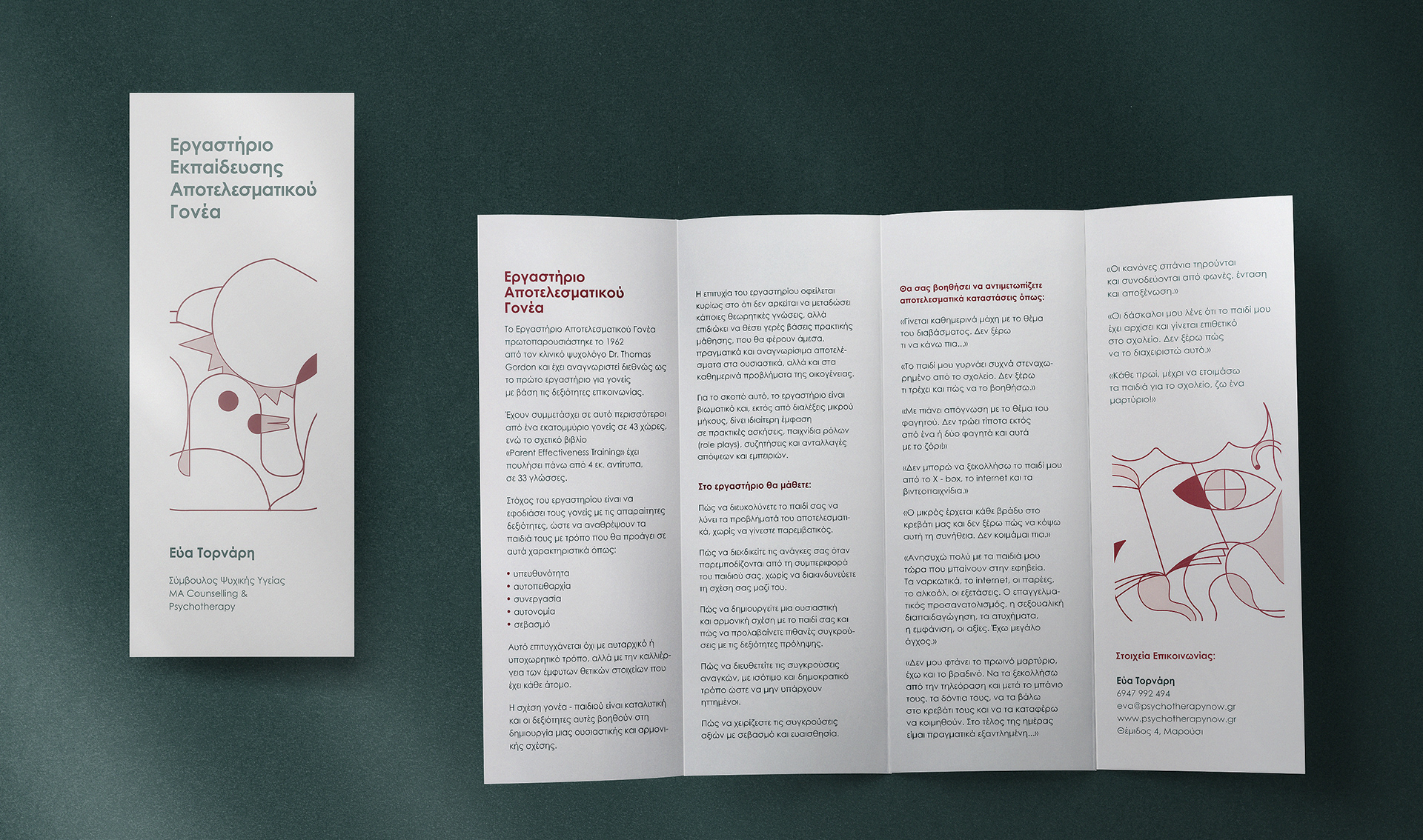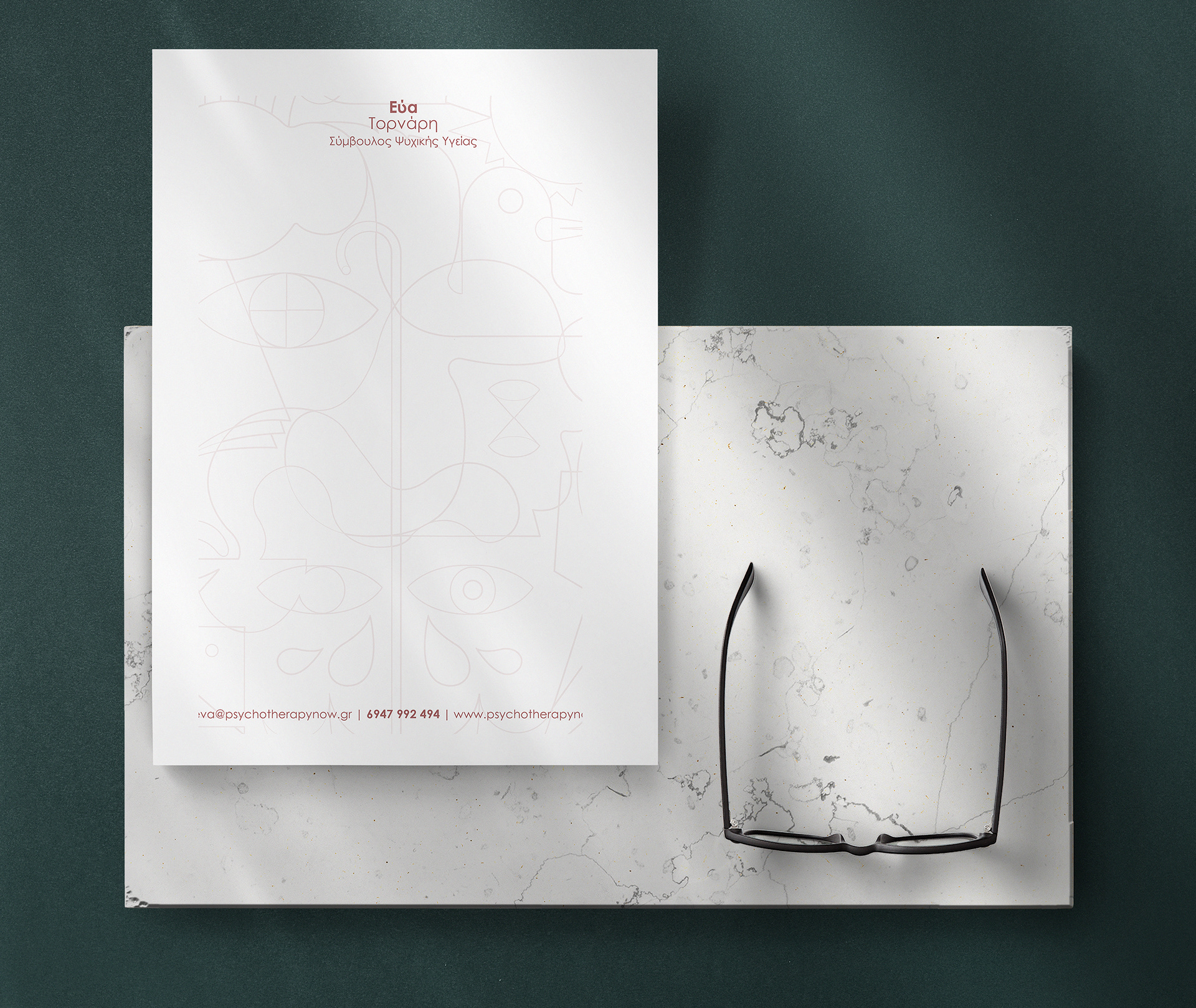 Eva Tornari, a Mental Health Counselor, assigned us to create her new corporate ID. Instead of following the path of creating a logo, we decided to do something different. We tried to reflect the complexity of the human soul through an illustration, imprinted in a minimal linear style that reminds of a twisted thread and separated it into 4 pieces. Each of them became the back of Eva’s business cards. Divided, they look like a beautiful abstract design. But when combined all together in the right order, they reveal us a bigger picture. Just like the riddle, we desire to solve when asking for the services of a mental health professional. Based on this illustration, we created a corporate identity with consistency, utilizing it beyond business cards, as an office decoration element, in brochures and other applications.